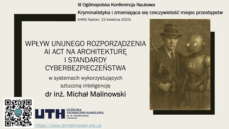 Prezentacja jest poświęcona analizie przyszłego wpływu rozporządzenia Parlamentu Europejskiego i Rady Unii Europejskiej – tzw. AI Act – na architekturę i standardy cyberbezpieczeństwa w systemach wykorzystujących sztuczną inteligencję (AI). AI Act, jako pierwsze kompleksowe ramy prawne regulujące zastosowanie AI, wprowadzi podejście oparte na analizie ryzyka, które zobowiąże projektantów, dostawców oraz użytkowników systemów AI do wdrażania zaawansowanych mechanizmów ochrony danych, zapewniania odporności systemów na ataki oraz stosowania przejrzystych procedur nadzoru.