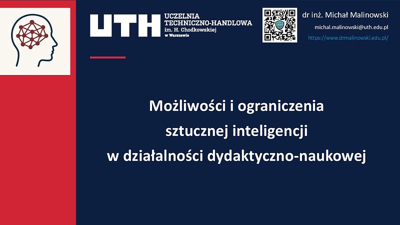Prezentacja koncentruje się na możliwościach oraz ograniczeniach sztucznej inteligencji (AI) w kontekście działalności dydaktyczno-naukowej. Analizowane są kluczowe aspekty rozwoju technologii AI, od podstawowych definicji i historii, po współczesne wyzwania, takie jak halucynacje AI, stronniczość w algorytmach czy kwestie etyczne związane z jej zastosowaniem. Wykorzystanie AI w edukacji, badaniach naukowych i procesach decyzyjnych jest przedstawione na przykładach z praktyki, z uwzględnieniem bieżących trendów w rozwoju technologii. Zajmujemy się także wpływem AI na systemy zarządzania i możliwości automatyzacji procesów, ze szczególnym uwzględnieniem technologii generatywnych oraz ich zastosowań w praktyce dydaktycznej. Ponadto, omawiamy również zagrożenia związane z bezpieczeństwem i prywatnością danych w kontekście intensywnie rozwijającej się sztucznej inteligencji.