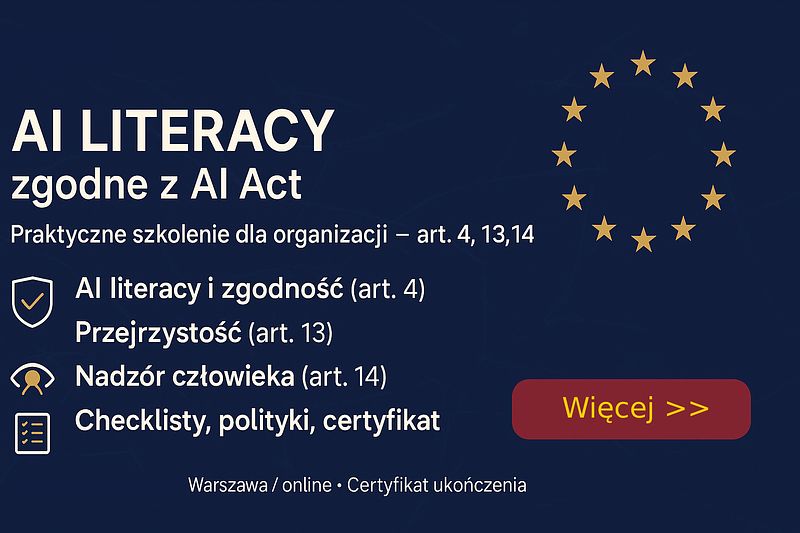 W Unii Europejskiej obowiązuje nowe prawo o sztucznej inteligencji zwane AI Act (rozporządzenie (UE) 2024/1689). Nakłada ono już teraz obowiązek na firmy i instytucje w Polsce, aby zadbały o to, by ich pracownicy rozumieli podstawy działania sztucznej inteligencji (AI) i potrafili z niej bezpiecznie korzystać. Dziś wiele organizacji nie jest świadomych tego wymogu. To prowadzi do ryzyka: błędów w pracy z narzędziami AI, naruszeń przepisów (np. o ochronie danych), a nawet szkód dla reputacji firmy. Opisane szkolenia pomagają w prosty sposób spełnić ten obowiązek: