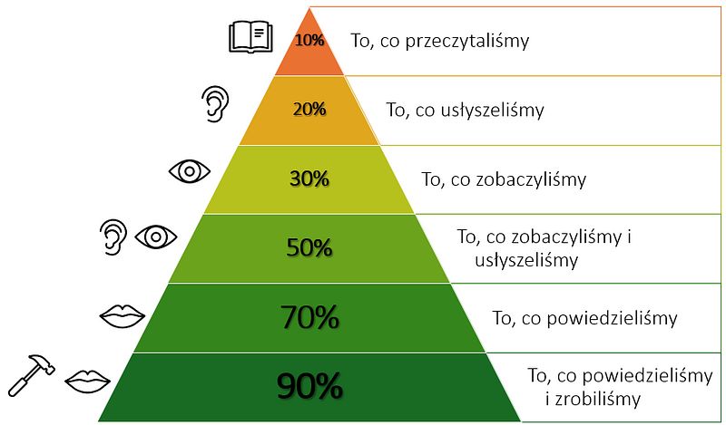 Piramida składa się z kilku poziomów, z których każdy reprezentuje inną metodę nauki i odpowiadający jej procent zapamiętanej informacji po dwóch tygodniach.