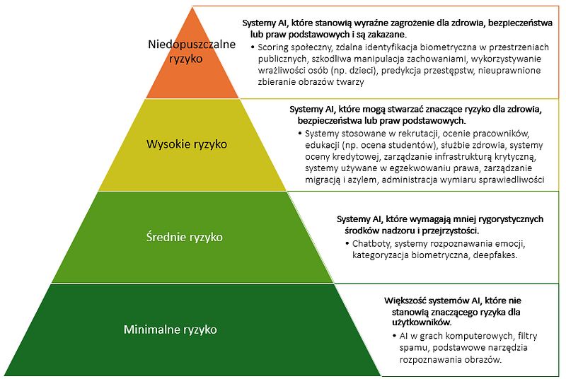 Rozporządzenie wprowadza klasyfikację systemów AI według poziomów ryzyka, co ma na celu zarządzanie i nadzór nad ich działaniem. Wyróżnia się cztery poziomy ryzyka: