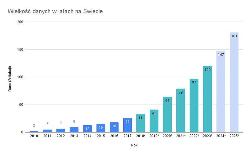 Świat generuje ogromne ilości danych każdego dnia. Dane te pochodzą z różnych źródeł, takich jak media społecznościowe, urządzenia IoT (Internet of Things), aplikacje mobilne, systemy biznesowe czy transakcje finansowe. W ciągu ostatnich lat ilość danych wzrosła wykładniczo, a prognozy wskazują na dalszy, gwałtowny wzrost w przyszłości. Dane są kluczowym zasobem w nowoczesnej gospodarce, jednak wraz z ich wzrostem pojawiają się wyzwania dotyczące ich przechowywania, analizy i bezpieczeństwa.