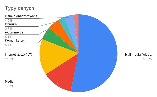 Dostępne informacje wskazują, że dane multimedialne (wideo, zdjęcia, audio) stanowią największy udział w ogólnej ilości danych. Pozostałe kategorie to: