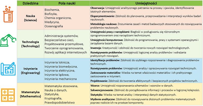 Współczesna gospodarka, coraz bardziej oparta na technologii, stawia duże wymagania przed rynkiem pracy. Dziedziny STEM rozwijają się w zawrotnym tempie, co tworzy duże zapotrzebowanie na specjalistów w tych obszarach. STEM obejmuje wiele sektorów, które mają kluczowe znaczenie dla przyszłości społeczeństwa: