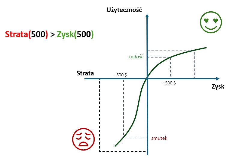 • Awersja do strat – Ludzie przywiązują większą wagę do unikania strat niż do osiągania zysków. Strata tej samej wielkości emocjonalnie boli bardziej niż zysk tej samej wielkości cieszy.