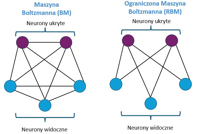 Ograniczona Maszyna Boltzmanna (RBM): Jest to uproszczona wersja klasycznej Maszyny Boltzmanna, gdzie jednostki ukryte i widoczne są podzielone na dwie oddzielne warstwy, a połączenia występują jedynie między tymi warstwami. Dzięki tej strukturze uczenie w RBM jest prostsze i bardziej efektywne.