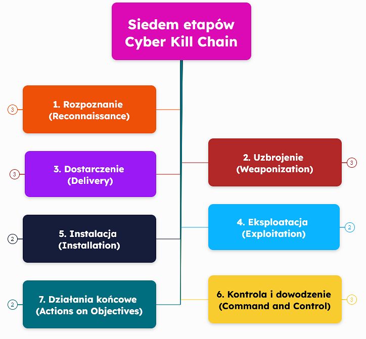 Model Cyber Kill Chain dzieli atak na siedem kluczowych etapów, które odzwierciedlają kolejne kroki wykonywane przez cyberprzestępców w celu osiągnięcia ich celu. Dzięki temu, że te etapy zostały szczegółowo opisane, specjaliści ds. cyberbezpieczeństwa mogą lepiej rozpoznawać ataki na wczesnym etapie i podejmować działania zapobiegawcze, co znacznie zwiększa szanse na zablokowanie ataku zanim dojdzie do poważnych strat.