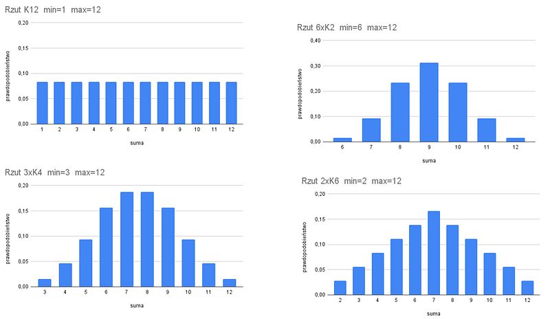 Interpretacja: Rzut jedną kością K12 daje maksymalny poziom losowości. Każdy wynik jest równie prawdopodobny, co sprawia, że gracz nie może przewidzieć wyniku ani na niego wpłynąć. Tego typu rzut jest idealny do mechanik gier, gdzie wynik każdego rzutu powinien być traktowany jako równorzędny i nie wpływać na balans rozgrywki.