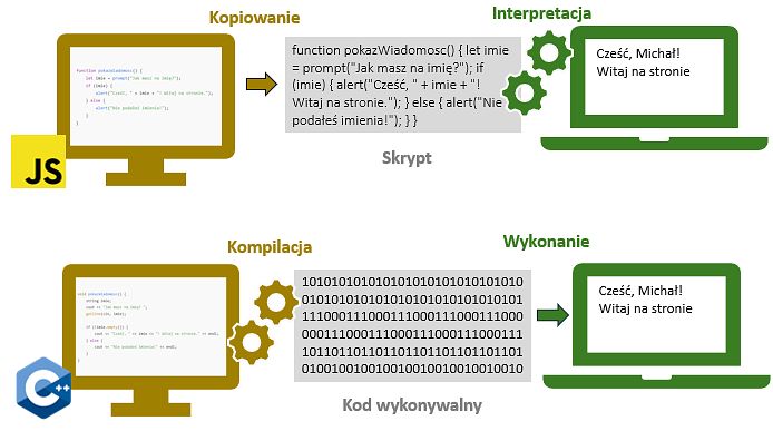 Kod źródłowy, czyli instrukcje zapisane w języku programowania, takie jak JavaScript czy C++, musi zostać przetworzony, aby komputer mógł go wykonać. W przypadku kompilacji kod źródłowy jest tłumaczony na język maszynowy przed jego uruchomieniem. Natomiast w przypadku interpretacji kod jest przetwarzany i wykonywany linia po linii w czasie rzeczywistym.