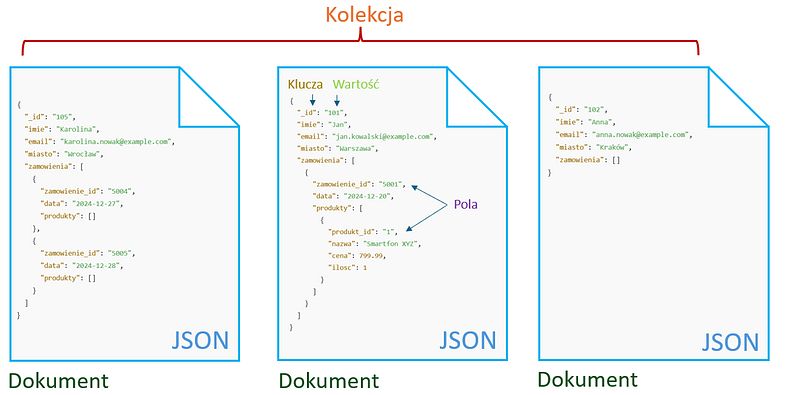 Każdy dokument zawiera złożone dane, takie jak tablice zamówień czy zagnieżdżone listy produktów, co znacząco upraszcza ich przechowywanie i zarządzanie w porównaniu do relacyjnych baz danych.