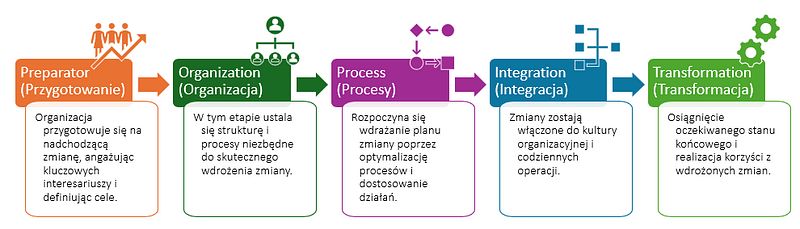 Zgodnie z jedną z interpretacji modelu POPIT przedstawioną na slajdach, proces jego stosowania można podzielić na pięć etapów, które są kluczowe dla zarządzania zmianą w organizacji: