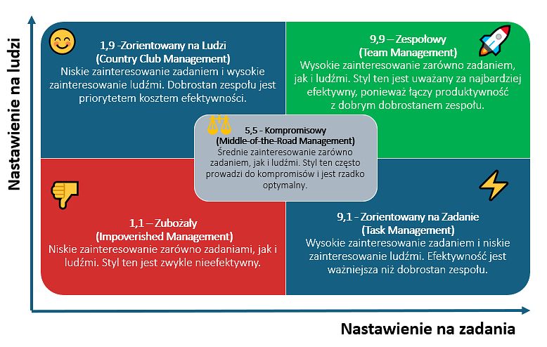 Model Blake’a i Mouton klasyfikuje style zarządzania na podstawie dwóch osi: