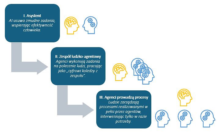 Faza 2 – Zespoły ludzi i agentów: Agenci AI wchodzą do zespołów jako cyfrowi współpracownicy, przejmując konkretne zadania pod kierunkiem ludzi.