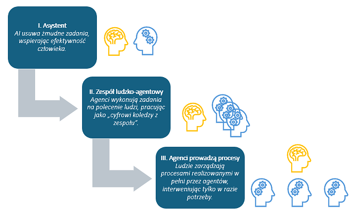 Faza 2 – Zespoły ludzi i agentów: Agenci AI wchodzą do zespołów jako cyfrowi współpracownicy, przejmując konkretne zadania pod kierunkiem ludzi.