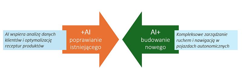 - W AI+ sztuczna inteligencja jest narzędziem wspierającym – dodawana do istniejących procesów bez ich redefiniowania. Przykładowo: firma korzysta z AI do usprawnienia obsługi klienta, ale rdzeń działalności się nie zmienia.