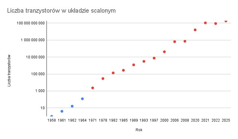 Geneza: W 1965 r. Gordon Moore (Intel) zaobserwował, że liczba tranzystorów na chipie podwaja się co około 18–24 miesiące.
