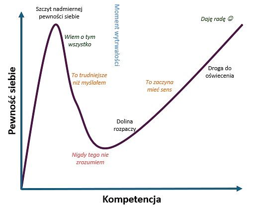 • Krzywa kompetencji – w miarę zdobywania elementarnej wiedzy poziom pewności siebie szybko rośnie (tzw. „szczyt głupoty”), a dopiero pogłębiona edukacja przywraca realistyczną ocenę własnych możliwości.