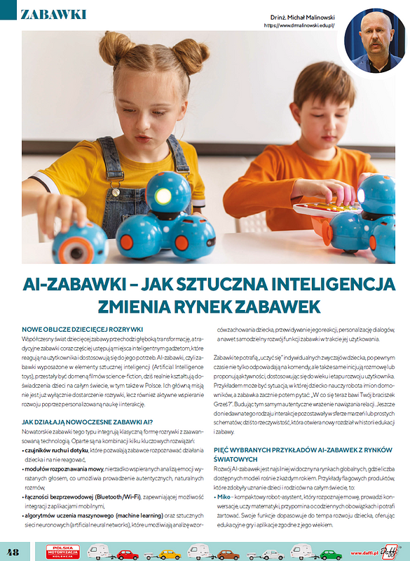 Artykuł przedstawia dynamikę rozwoju inteligentnych zabawek wyposażonych w elementy sztucznej inteligencji. Autor omawia mechanizmy działania tego typu produktów, integrujących tradycyjne formy rozrywki z zaawansowanymi technologiami, takimi jak czujniki ruchu, rozpoznawanie mowy, uczenie maszynowe czy sieci neuronowe. W tekście zaprezentowano przykłady najpopularniejszych rozwiązań rynkowych (m.in. Miko, Anki Cozmo 2.0, LEGO Mindstorms, Sphero BOLT, Sony AIBO) oraz dokonano analizy perspektyw ekonomicznych i edukacyjnych tego sektora. Autor wskazuje, że globalna wartość rynku „smart toys” w 2023 r. wyniosła ok. 12 mld USD i prognozuje wzrost do 25 mld USD do 2030 r. Szczególną uwagę poświęcono sytuacji w Polsce, gdzie rynek AI-zabawek wciąż pozostaje niszowy, głównie ze względu na wysokie ceny i ostrożność konsumentów, lecz stopniowo zyskuje na znaczeniu w edukacji i sprzedaży detalicznej. Artykuł podkreśla potencjał AI-zabawek w rozwoju poznawczym, emocjonalnym i społecznym dzieci, wskazując jednocześnie na konieczność edukacji rodziców oraz dostosowania oferty producentów i dystrybutorów do specyfiki lokalnego rynku.